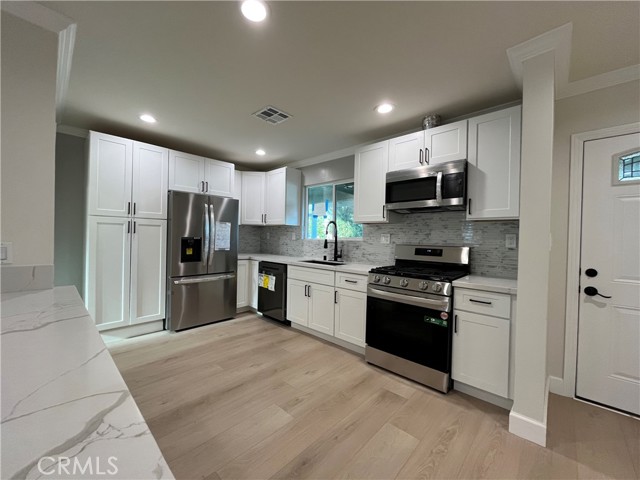 Granada Hill single-story home, UPGRADED + MOVE IN READY! Amenities include: 3BR + 2.5BA, open floorplan w/1500 SQF; living room w/fireplace; kitchen w/large center island, quartz countertops + stainless steel appliances (refrigerator, stove/oven, dishwasher + microwave included); dining area; in-unit laundry w/stacked washer + dryer hook-ups; central HVAC; dual pane windows; ceiling fans; recessed lighting; wood laminate flooring; backyard w/covered patio + sprinkler system; gardening service provided; driveway parking; pets considered w/owners approval + additional deposit.