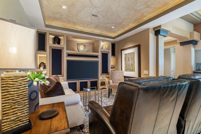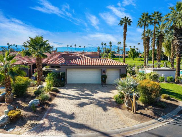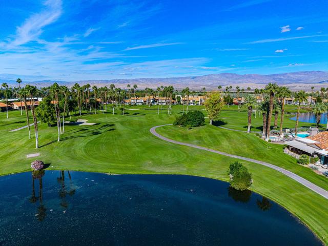 Elegance and extraordinary views define this Willow Plan condo in the guard-gated Palm Valley Country Club in Palm Desert CA. This single-level 3 bedroom / 3.5 bath home is situated at the end of a quiet cul-de-sac, adjacent to a community pool and spa. Offered Turnkey Furnished, this beautifully updated condo is move-in ready! Overlooking a lake and double fairways, #4 & #5 of the Challenge Course, this stunning home provides expansive west and south mountain and golf views! The extended, tiled, and fenced private patio is designed for effortless desert living, featuring a brand new full-width awning, outdoor fireplace, and built-in BBQ area - ideal for dining, entertaining, or simply enjoying the panoramic backdrop. Inside, the open-concept floor plan includes a spacious living room, wet bar, and kitchen that flow seamlessly out to the patio, maximizing natural light and those incredible views. A separate viewing or media area offers the perfect setting for movie nights or game days. The updated kitchen features granite countertops and convenient island seating. The front guest bedroom is currently used as an office with a Murphy bed for flexible living. The primary suite includes a private courtyard accessed through sliding doors, while the ensuite bathroom has been updated with a modern shower, dual sinks, and designer finishes. The second guest bedroom is also ensuite, providing comfortable accommodations for family & guests. Additional features include a powder room, separate laundry room, and an attached 2-car plus golf cart garage with epoxy floors, built-in storage, and direct access into the home. The paver driveway and walkway add to the home's elegant first impression. Palm Valley Country Club is a private guard-gated community with 2 Ted Robinson designed Golf Courses, Fitness Center/Spa, 16 Tennis Courts + Pickleball & 46 Community Pools & Spas. HOA fee includes social membership for Clubhouse/ Dining, security, cable/internet, exterior paint & roof, landscaping & trash. Options are available for separate Fitness/Golf memberships. Short-term rentals are permitted (28 days or less), with City of Palm Desert permit.