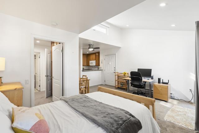Stylish, efficient, and full of natural light, this beautifully updated Serra Mesa studio makes the most of every inch of its 441 square feet. The layout feels surprisingly spacious with vaulted second-story ceilings, new recessed lighting, a ceiling fan, dual-pane windows, and fresh paint throughout. The main living area easily accommodates a queen-size bed, sofa, TV setup, and even a small workspace, while the charming dining nook offers a dedicated spot for meals or study sessions. A private balcony (see suppl) adds an inviting outdoor extension of the space, perfect for morning coffee or fresh air. The full kitchen is a standout for a studio, featuring granite countertops, electric appliances, and an impressive amount of cabinet storage. New carpet and the overall clean, move-in-ready presentation make this home easy to love from the moment you step inside. Located in the heart of Serra Mesa, this home offers unmatched central convenience with quick access to Mission Valley, Kearny Mesa, SDSU Mission Valley, Snapdragon Stadium, the Convoy District, and major freeways including the 163, 805, 15, and 8. Its affordability makes it an ideal opportunity for first-time buyers looking to enter the San Diego market, students wanting an alternative to renting near campus, or investors seeking a low-maintenance rental in a consistently high-demand neighborhood. This charming studio is a rare find at this price point and offers a smart way to own a piece of San Diego.