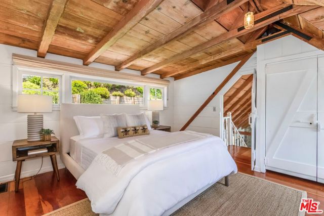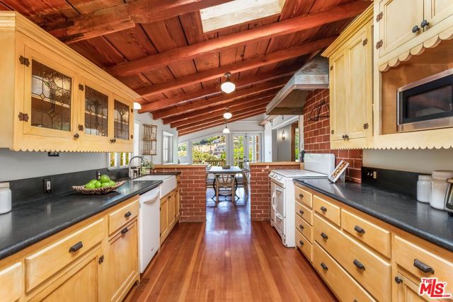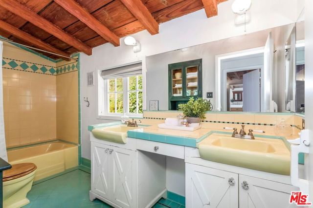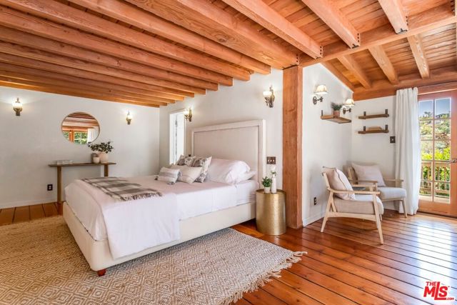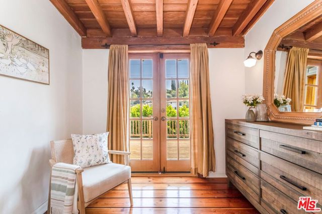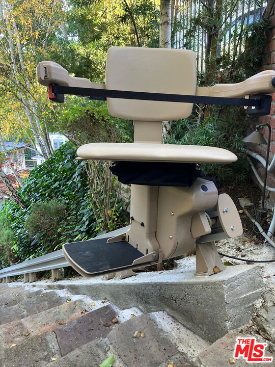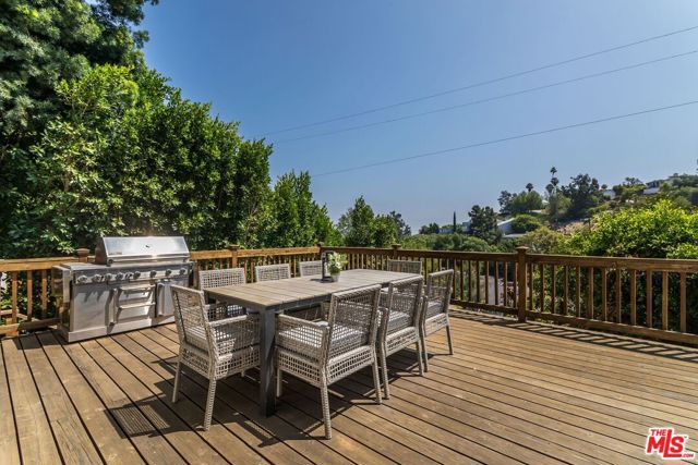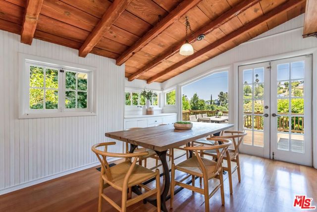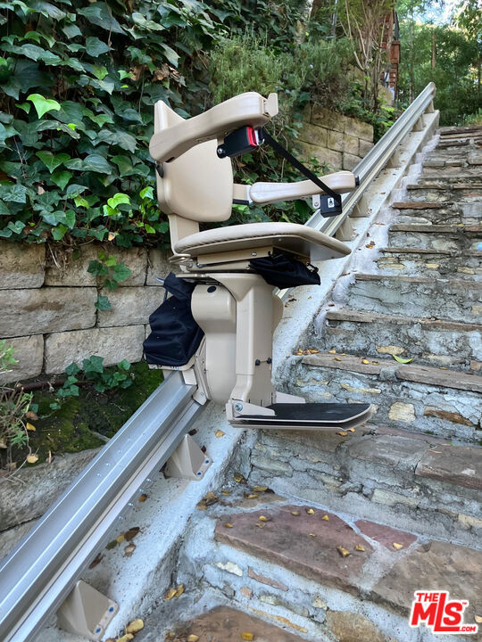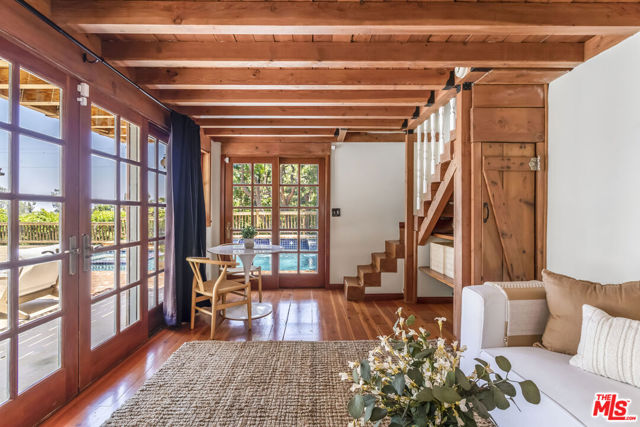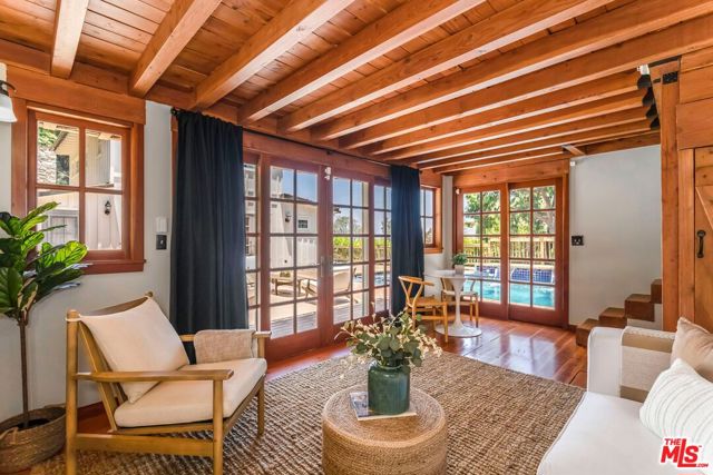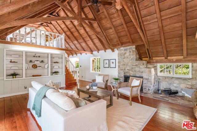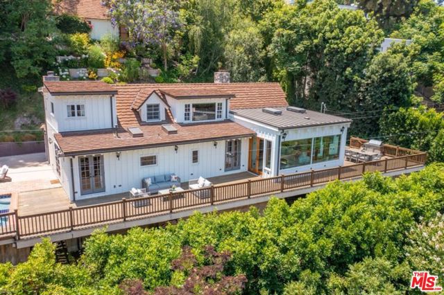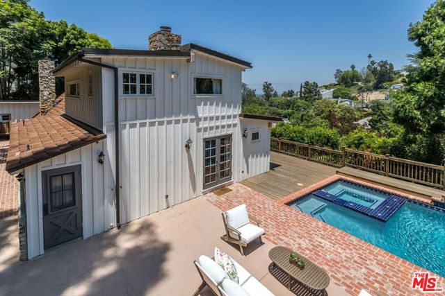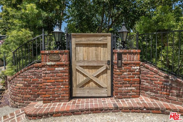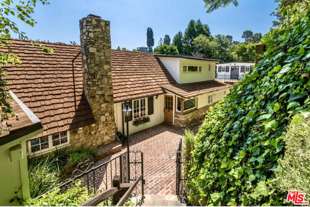 NEW exterior moving stairlift! *This magnificent Connecticut-style residence is situated on approximately 1/3 acre in the Sherman Oaks Hills. Built in 1942 and reminiscent of Robert Byrd's detailed architectural design, the captivating family home is a gated, hidden haven that features 3bd/3ba in the main house, plus a separate 1bd GUEST HOUSE (not included in sq footage), a large POOL with FOUNTAINS and SPA, and breathtaking VIEWS. After descending the custom stone staircase, guests are greeted by a storybook home that is incomparable in design and charm. The interior spaces boast remarkable craftsmanship, including a living room with handcrafted wood beams supporting a vaulted ceiling, hand-pegged floors, a large decorative fireplace, and bespoke latch doors and bookcases. The adjoining expansive great room incorporates reclaimed wood plank floors and massive windows on three sides to shower the space with light while framing the magnificent exterior vistas. Artistic detailing has been retained in the custom-built kitchen with its sunny breakfast area and beautifully crafted built-ins, while the cooking area is equipped with granite counters and the original 1947 O'Keefe and Merritt stove. Included in the impressive primary suite is a massive stone fireplace, walk-in closet, a bathroom with a clawfoot tub, and an adjoining alcove/study with pool access. One of two enchanting guest suites completes the lower-level bedroom wing. A second-story loft/office area with sweeping views leads to an additional guest suite with pitched ceilings and a large private bathroom complete with a sitting/dressing area. French doors throughout the home open to the enormous deck that accommodates several large entertainment spaces with barbecue areas, as well as a sparkling POOL that features a built-in spa, fountain, and an automatic cover. Overlooking the pool, the 2-story bonus GUEST HOUSE is suitable for use as an office, guest quarters, studio, or media room(s) with access to a detached bathroom with shower. The custom stonework and lush landscaping with colorful florals all add to the magical outdoor ambience. Street-level parking includes a two-car garage and two extra parking places. The new custom stairlift serves as an alternative to the exterior staircase that leads to this hidden oasis. This extraordinary celeb-owned home, perfect for family living as well as for entertaining, is not only emotional...it is unforgettable!