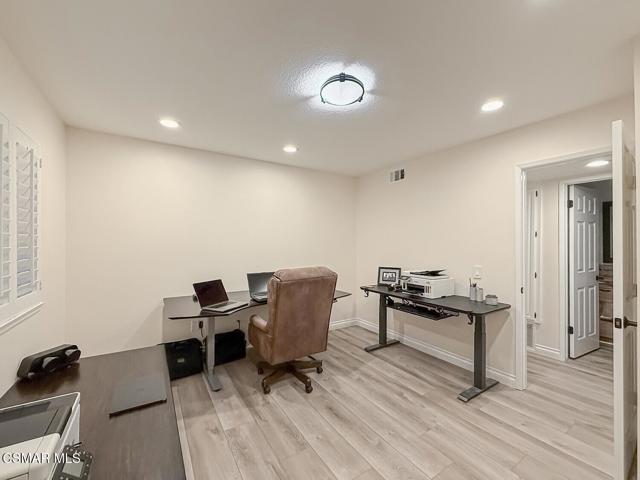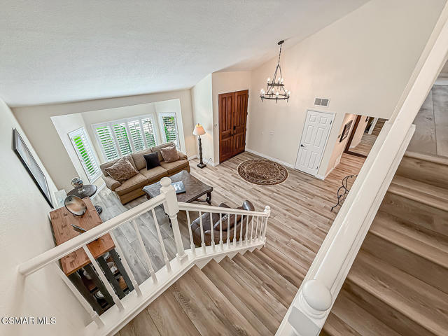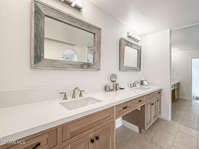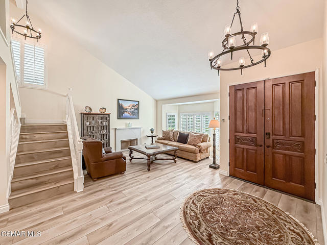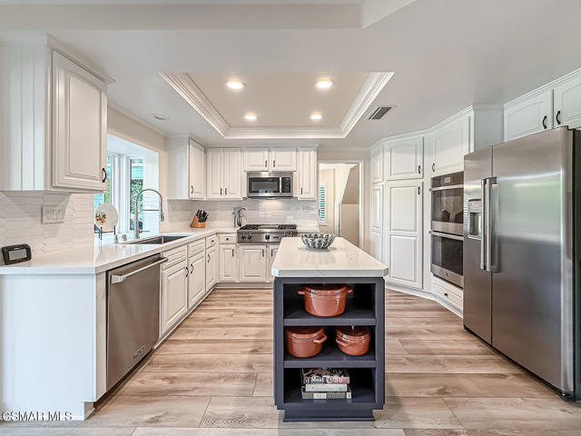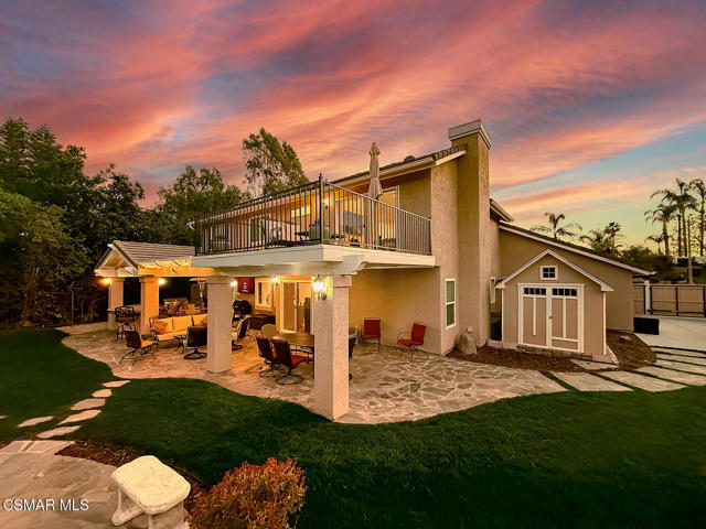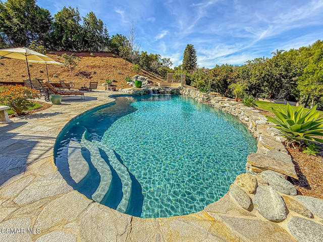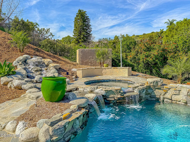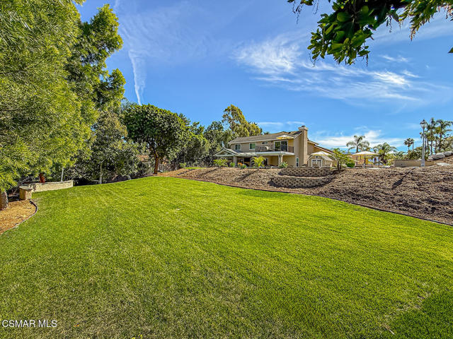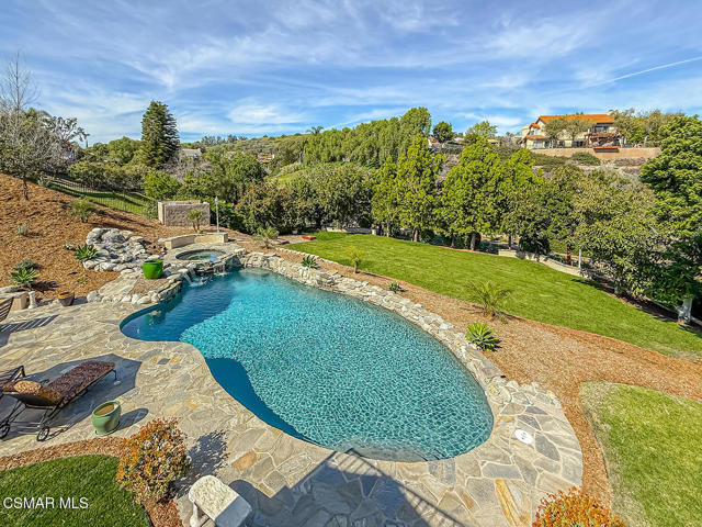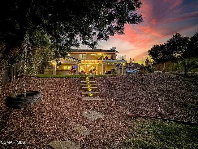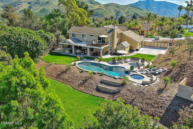 4BR/3BA home in Santa Rosa Valley, Camarillo. Heated pool and spa. 3-car garage. Remodeled kitchen and baths. Built 1988. No HOA. This 4 bedroom, 3 bath single family residence in Santa Rosa Valley, Camarillo offers 2,211 square feet on a 25,264 square foot lot with no HOA. Built in 1988 and updated throughout, the home includes a heated in-ground pool and spa, three-car attached garage, and RV access. Entry is ground level with no steps.The interior features an open floor plan with two story ceilings, recessed lighting, and wood-like flooring throughout. The refreshed kitchen includes quartz counters, a center island, greenhouse window, gas range, oven, microwave, dishwasher, garbage disposal, and refrigerator. The kitchen opens to the family room and formal dining area, creating connected living spaces. The living room has been brought to one level and includes a gas fireplace in the living room. A main floor bedroom and full bath add flexibility. Upstairs bathrooms include updated vanities, and the primary suite offers a walk-in closet and updated bath with double vanities, separate shower stall, and soaking tub.Major improvements include new tile backsplash, updated counters, partial roof replacement, new paint, double pane windows, plantation shutters, a new motorized gate, and new side yard landscaping. The home is on public sewer and district water with central A/C, ceiling fans, concrete slab foundation, and indoor laundry room.Outdoor features include a covered and open patio with stone finishes, landscaped front and rear yards with sprinkler system and timer, vinyl and wrought iron fencing, and a gated driveway with direct garage access. The pool and spa are filtered and heated.Located in the Marlborough 2 tract in Santa Rosa Valley, this property offers space, updates, and practical improvements on a large lot. Close of escrow possession. Zoned RE30AV.