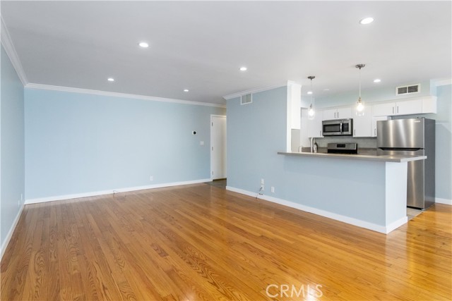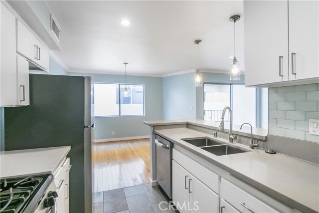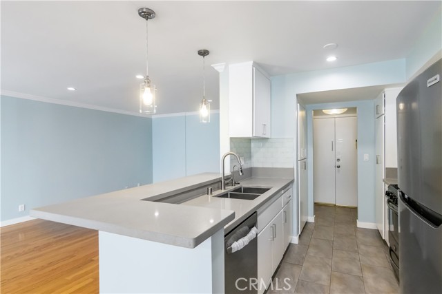 Welcome to this elegant Southern-style building, framed by stately columns and surrounded by graceful magnolia trees. Inside, discover a beautifully remodeled 2-bedroom, 2-bath condo that perfectly balances modern style, comfort, and convenience. Located just moments from Ventura Blvd’s premier dining, shopping, and entertainment, this home offers the best of Sherman Oaks living — vibrant city energy paired with a relaxed neighborhood feel. The interior features hardwood and tile floors throughout, with rich natural wood in the living and dining areas and sleek tile in the kitchen, baths, and hallway. The chef-inspired kitchen stands out with stainless steel appliances (including a refrigerator), gray quartz countertops, a raised breakfast bar, and ample cabinetry — ideal for both everyday living and entertaining. An open-concept layout flows seamlessly into a spacious living area highlighted by crown molding and modern lighting. A central hallway separates the two generous bedrooms, each offering ample closet space and tastefully updated finishes. Every detail has been thoughtfully designed to create a home that feels both elegant and move-in ready. Enjoy resort-style amenities including a sparkling community pool, two assigned parking spaces in the secured subterranean garage, and convenient on-site laundry facilities. Water and trash services are included for added ease. Experience Southern charm and modern living — all in one exceptional Sherman Oaks residence.