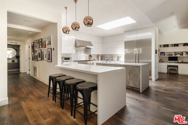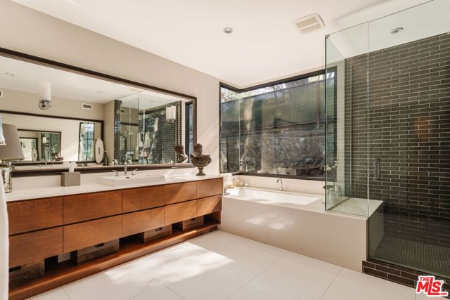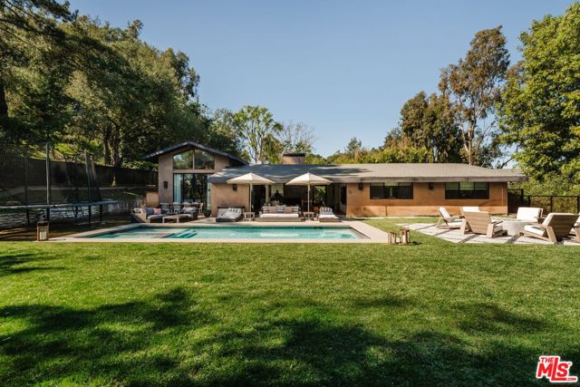 Originally designed by renowned architect Edward Fickett, this quintessential mid-century residence has been thoughtfully transformed to embrace today's seamless indoor outdoor Southern California lifestyle. Set at the end of a private tree-lined driveway and positioned well above the street, the home offers exceptional seclusion on a serene, beautifully landscaped lot behind a gated motor court.The residence features six bedrooms and four baths. The open living room is defined by pitched ceilings, skylights, hardwood floors throughout, and a statement fireplace that anchors the space. Expansive glass doors create a natural transition to the outdoors, where a private backyard retreat awaits.The grounds include a heated pool and a large area of flat grassy yard, a rare and valuable offering in Bel Air. A spacious fire pit lounge provides the perfect setting for entertaining or relaxed evenings under the stars.Blending architectural integrity with modern livability, this exceptionally private and secure Bel Air residence captures the enduring appeal of classic mid-century design.