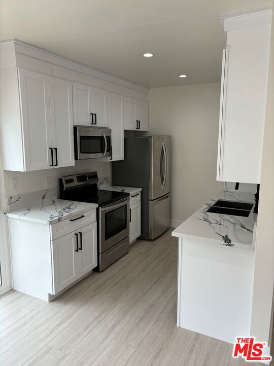 Freshly renovated 2 bed/2 bath in the top floor of a quiet, well kept building in the heart of Santa Monica. Includes 1 parking spot (covered) and laundry room on site. Brand new remodeled kitchen with fridge/freezer, oven, dishwasher, and microwave. Both bathrooms remodeled. New recess lighting in the ceiling. Lots of natural light. Large balcony. Private staircase to entry, and unit is in a secluded portion of the building. Steps away from retail, restaurant, and more.