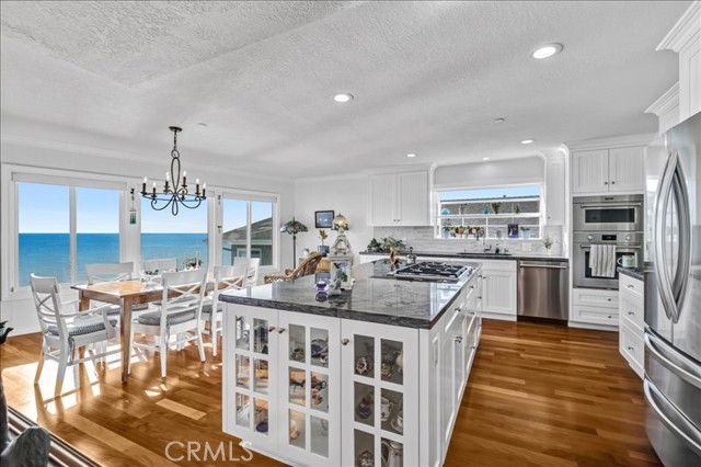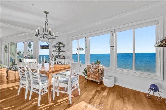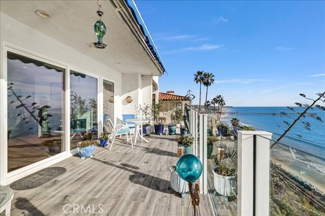 Oceanfront Living with panoramic views of the San Clemente Pier, coastline, Catalina Island, and sunset views. Positioned directly above the sand within an intimate three residence enclave, this rare top floor, single level 2-bedroom, 2 bath penthouse offers approximately 1886 square feet of refined coastal living. Sweeping, unobstructed Pacific panoramas extend from San Mateo Point to Dana Point. Expansive walls of glass frame dramatic white-water views from the living and formal dining areas, opening seamlessly to generous oceanfront terrace featuring a retractable awning- designed for sunset entertaining and effortless indoor-outdoor living. From this elevated vantage point, enjoy year-round dolphin sightings, seasonal whale migrations, and on clear evenings, distant rocket launches along the horizon. The primary suite offers private balcony access, serene hillside views, and beautiful morning light a rare balance of sunrise and sunset perceptive. Extensively remodeled in 2021-2022, the residence showcases rich mahogany flooring throughout and quality custom upgrades. All windows and patio doors were replaced with energy efficient Milgard products using new construction installation. A custom door enhances the arrival experience. The remodeled kitchen features custom cabinetry, granite countertops, designer tile backsplash, center island and newer appliances, flowing seamlessly into ocean facing entertaining spaces. Both bathrooms were fully reimagined with custom cabinetry stone surfaces, newer tub, refined tilework and updated fixtures. Additional enhancements include a redesigned gas-burning fireplace with custom mantle and built-ins, updated lighting, new interior and closet doors, complete interior repaint, retiled ocean side terrace with glass railing, refreshed streetside balconies, two-car gated underground parking, private storeroom, 240-volt EV receptacle, and new 50-gallon gas water heater. Building upgrades (2020-2025) include a new asphalt roof, TruExterior siding, exterior repaint, and improved stairwell lighting. Ideally located within walking distance to the beach trail, San Clemente Pier, North Beach, Miramar, and downtown dining and shopping. Blufftop oceanfront residences of this scale and privacy are rarely available.