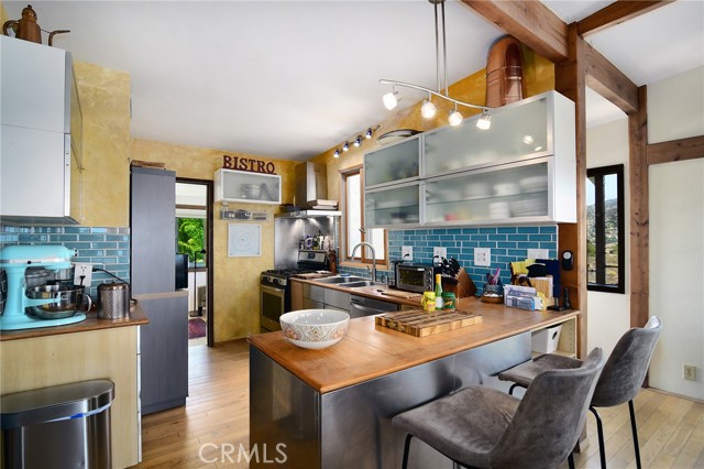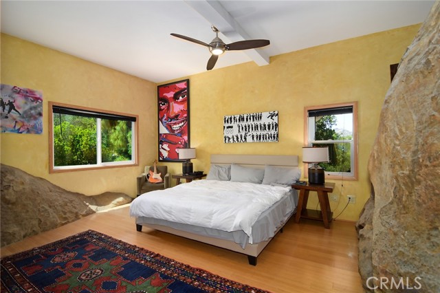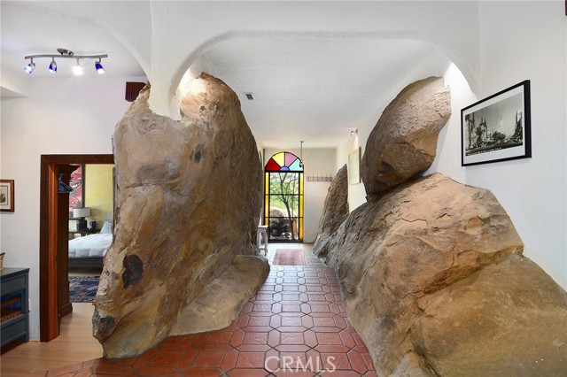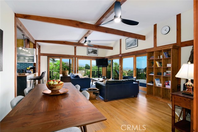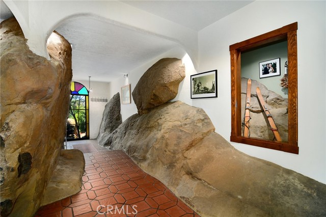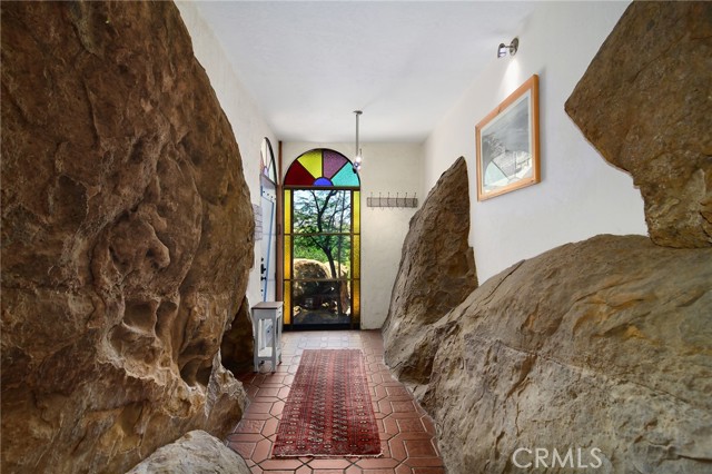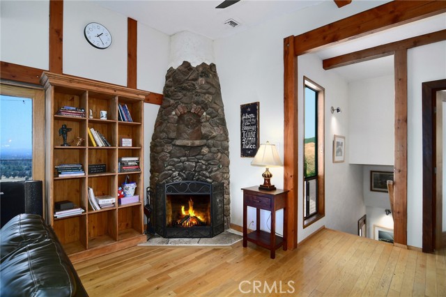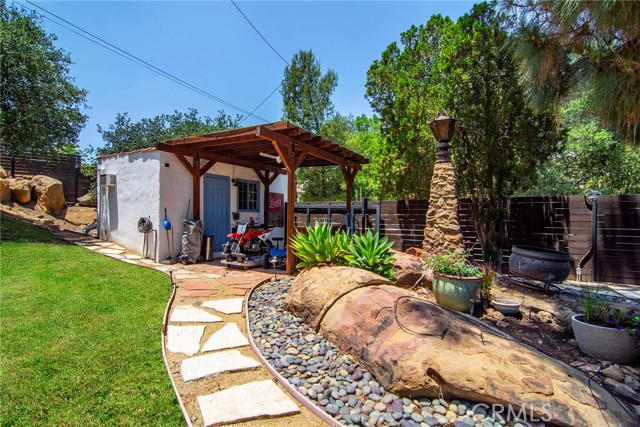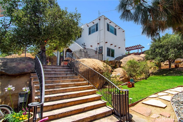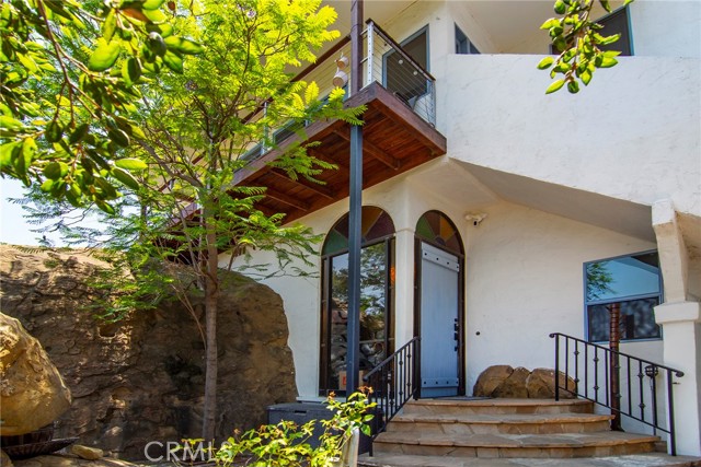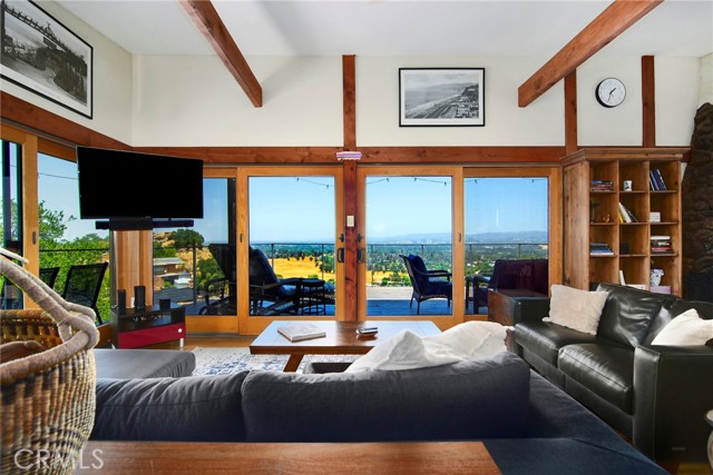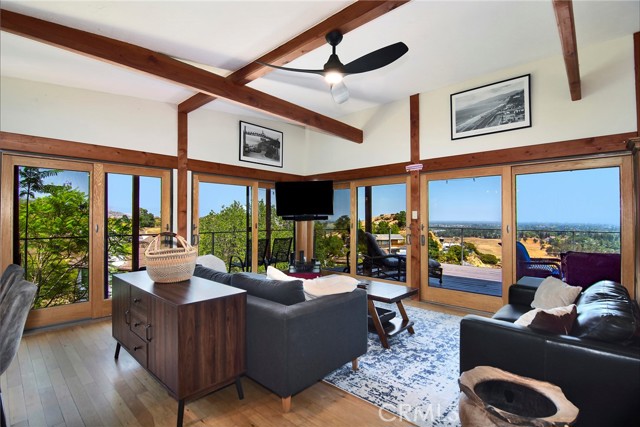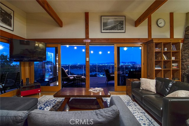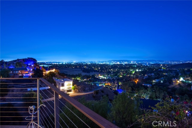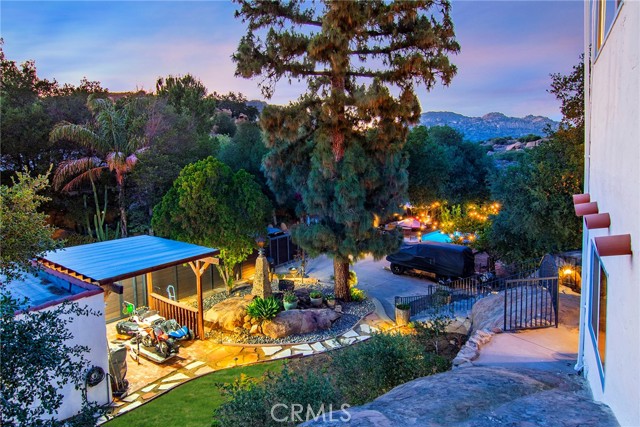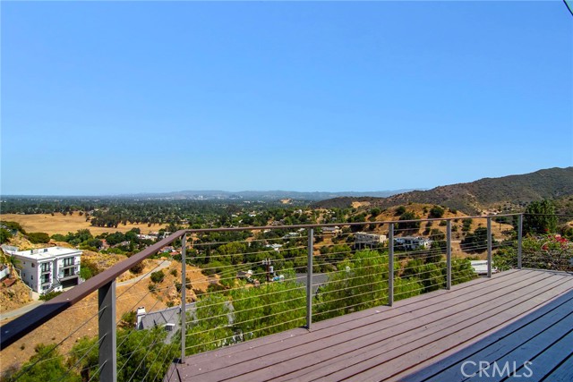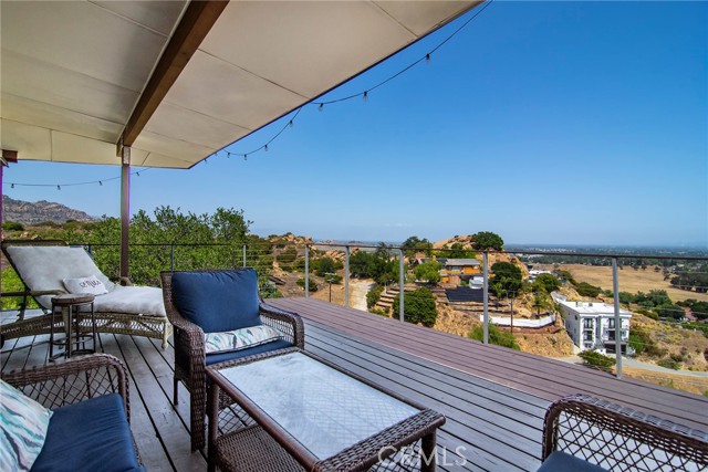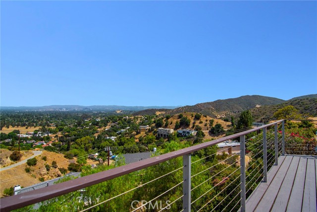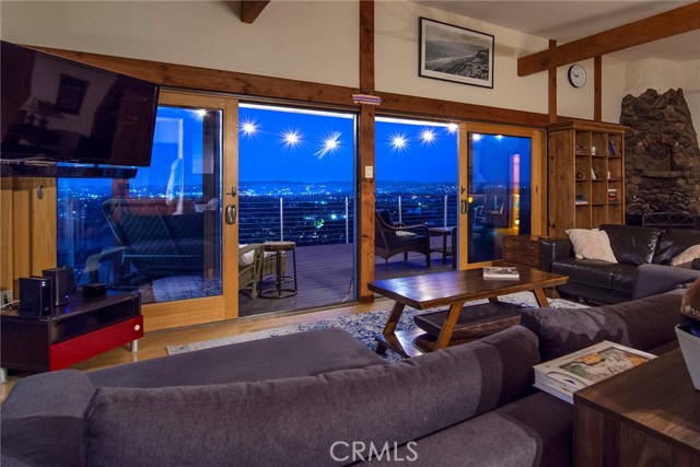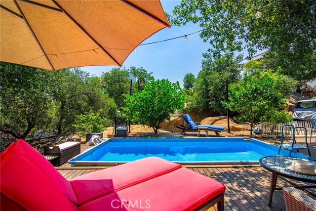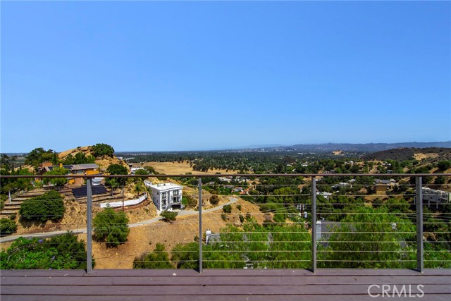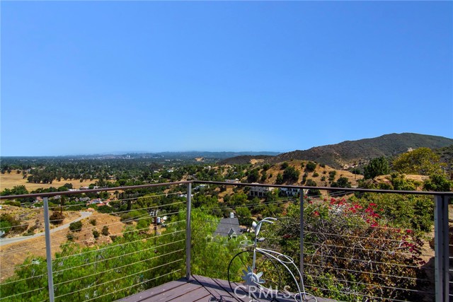 This Spanish adobe residence is situated on a sandstone ridge in West Hills, offering unobstructed 360-degree views of the San Fernando Valley and surrounding canyon terrain. The home includes 3 bedrooms and 3 full bathrooms across an open-concept layout featuring vaulted ceilings with exposed wood beams. Interior living spaces connect directly to the outdoors through expansive sliding glass doors, opening to a wraparound deck, sun deck, and an above-ground pool with custom wood decking integrated into the landscape. Multiple outdoor areas provide defined spaces for dining, lounging, and enjoying panoramic valley and canyon views beneath mature trees. Recent upgrades include solar panels, a 200-amp electrical panel, landscape lighting, and a dedicated electrical panel serving the pool area. The property is fully fenced with Mangaris wood and includes two storage sheds, a one-car detached garage with adjacent carport, and additional on-site parking. Technology features include five Ring security cameras, a remote-controlled thermostat, a WiFi-enabled front gate deadbolt, and a mesh Wi-Fi system supporting indoor and outdoor coverage. Additional property features include mature oak trees and a main sewer connection (no septic). Located at the end of a no-through street, the property offers privacy and direct access to nearby hiking trails, combining architectural character, elevated views, outdoor living spaces, and modern systems.