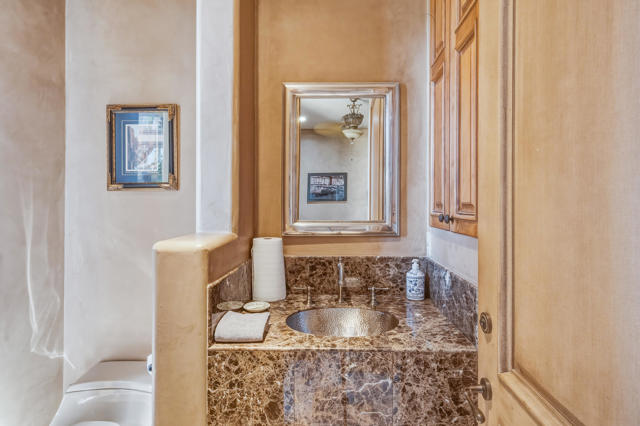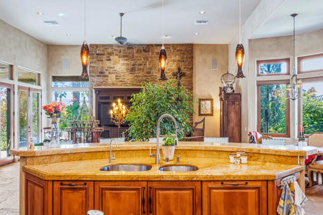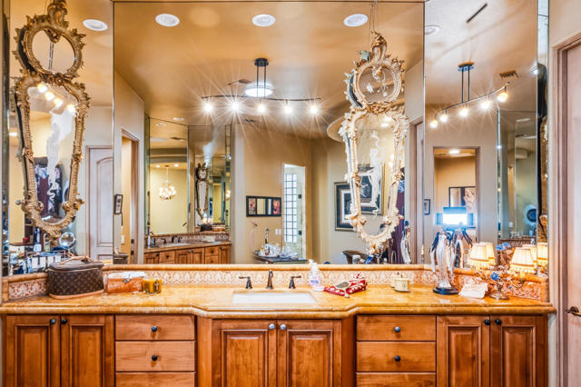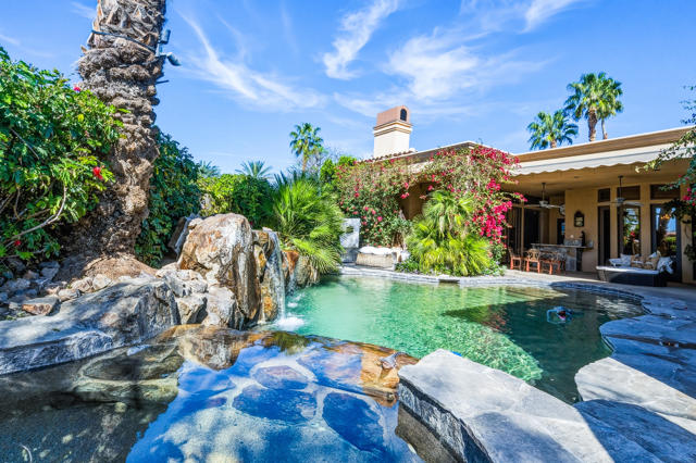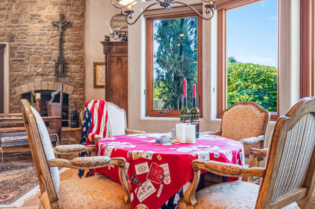 La Vie en Rose -- A Montmartre-Inspired European Villa Estate in the Heart of Palm DesertEvoking the bohemian romance of Paris's 18th arrondissement, this Montmartre-inspired custom estate blends Old World European villa elegance with refined modern luxury. Located minutes from Desert Willow Golf Resort in prestigious Montecito Estates, this extraordinary residence offers approximately 4,650 square feet of curated craftsmanship, timeless architectural detail, and breathtaking southwest mountain views.Privately positioned on a premier interior corner cul-de-sac lot in central Palm Desert, palatial entry doors open to imported flagstone flooring and a dramatic formal dining room with a built-in illuminated wine cellar -- a stunning focal point for elegant entertaining. Sparkling chandeliers grace each room, while oversized framed windows capture panoramic wrap-around mountain vistas and flood the home with natural light.The grand great room is anchored by a striking stone-wrapped fireplace. The chef's kitchen is designed for both intimate gatherings and large-scale entertaining, featuring three built-in ovens, a six-burner gas cooktop, natural stone countertops, custom cabinetry, and a glass-door walk-in pantry with built-in storage and continued stone finishes.This five-bedroom, five-and-a-half-bath estate includes a private-entry casita currently styled as an executive office with custom built-ins and exterior access. One additional guest bedroom also offers a private entrance. Ideal for guests. Each of the six bathrooms showcases bespoke custom tilework, giving every suite distinctive European character and spa-inspired appeal.Originally built by a custom homebuilder as his personal residence, the quality is exceptional, with top-tier craftsmanship and extensive natural stonework throughout.Outdoors, professionally designed landscaping surrounds a private patio retreat with pool, spa, tranquil water features, misting system, and built-in BBQ with bar top -- all oriented to capture spectacular southwest-facing mountain views for seamless indoor-outdoor luxury living.Additional amenities include a fully owned $100,000 solar system, Tesla Powerwall energy storage, Nuvia water softening system, and a finished, air-conditioned oversized three-car garage.Situated within five miles of world-class shopping, fine dining, entertainment, and healthcare -- and surrounded by the acclaimed fairways of Desert Willow Golf Resort