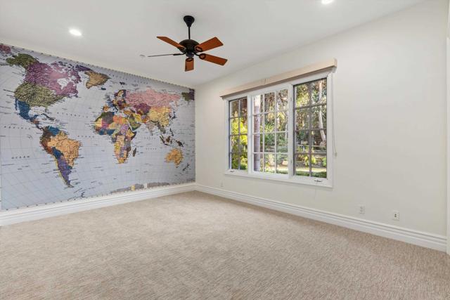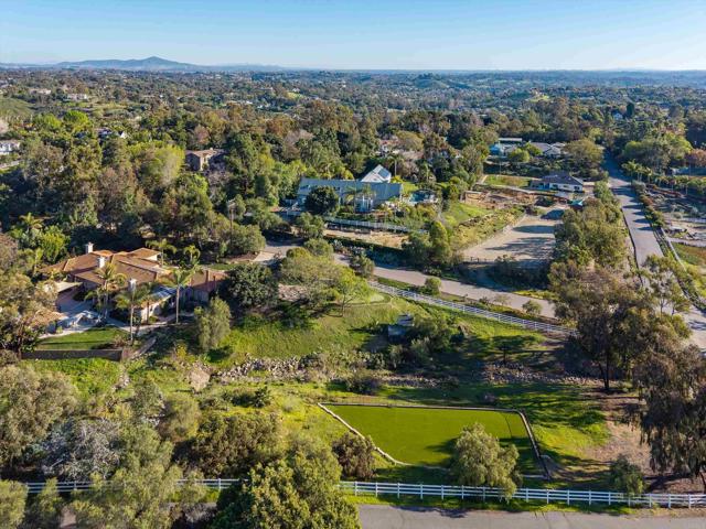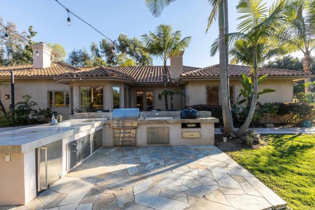 Tucked behind private gates in one of Encinitas' most coveted equestrian neighborhoods, this stunning single-level estate delivers the rare combination of refined interior living and resort-caliber outdoor entertaining — all on 2.59 sprawling acres with no monthly HOA fees. Soaring ceilings and abundant natural light welcome you from the moment you arrive. The open-concept floor plan flows seamlessly room to room, anchored by a chef's kitchen appointed with a professional Wolf range, side-by-side refrigerator/freezer, wine refrigerator, and warming drawer. Brand new carpet and wood floors run throughout, complemented by fresh paint that gives the entire home a crisp, move-in ready feel. 4 bedrooms plus a wainscoted office — ideal as a private study or work-from-home retreat — complete the thoughtfully designed interior. Step outside and discover a backyard that rivals the finest resorts. The outdoor living room sets the stage for effortless entertaining, anchored by a grand BBQ island with marble countertops, a Lynx grill, and dedicated smoker. Romantic string lights and a stylish sun shade create the perfect ambiance from afternoon to evening. The sparkling saltwater pool, lush grass lawn, and a brand new artificial turf sports field — ideal for soccer, lacrosse, and active play — offer something for everyone. Horse zoning adds the rare potential to create your own private equestrian retreat. The home's 42-panel paid solar system dramatically reduces energy costs, a whole-home water filtration system ensures clean drinking water, and the oversized four-car garage delivers exceptional storage and flexibility. Every upgrade has been executed with purpose. Served by the award-winning Encinitas Union School District and the highly sought-after Olivenhain Pioneer Elementary, with top-rated middle and high schools rounding out an exceptional educational pathway. All of this — gated privacy, 2.59 acres, luxury finishes, and equestrian zoning — just minutes from the beaches, boutiques, and dining of downtown Encinitas.