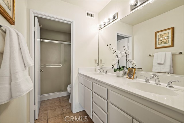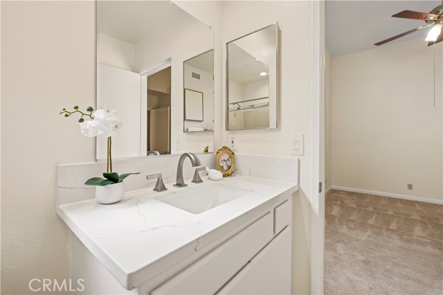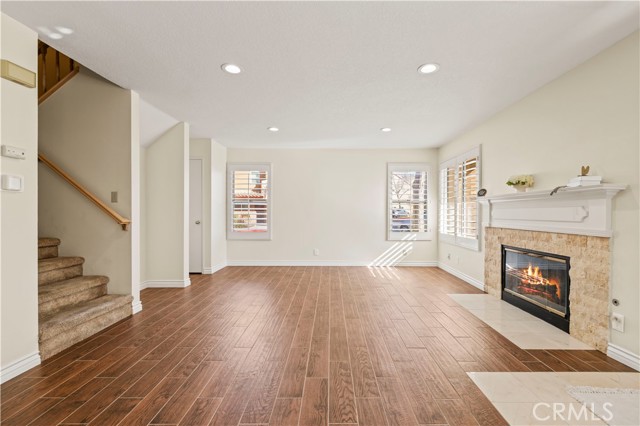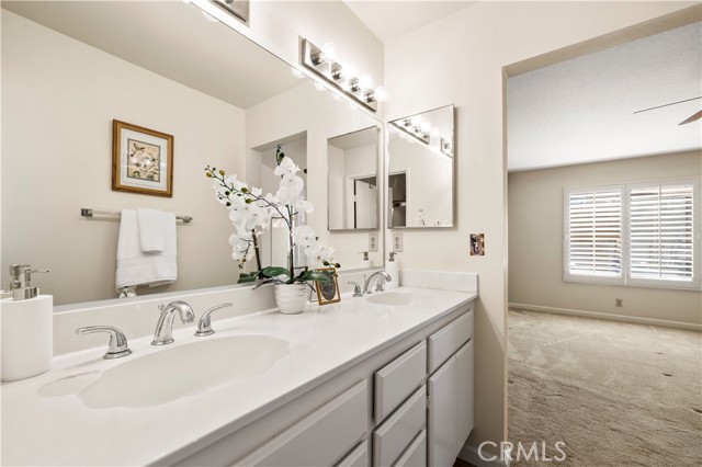 Welcome home to this beautifully updated two-story 2-bedroom, 2.5 -bath residence located within the quiet, private, gated Mountainview Villas community, surrounded by mature, lush green trees that create a serene, park-like setting. Thoughtfully refreshed throughout, this home blends comfort, functionality, and understated style while offering a peaceful retreat in one of the area’s most desirable neighborhoods. The main level features an open living and dining area filled with abundant natural light from large windows, complemented by recessed lighting throughout the main level for a bright, modern feel. Wood-look tile flooring downstairs, fresh interior paint, and updated finishes create a clean, contemporary aesthetic. A cozy fireplace with a beautiful stone surround anchors the living space, making it ideal for everyday living or relaxing evenings at home. Custom wood interior shutters throughout enhance privacy and timeless appeal. The kitchen opens seamlessly to the dining area, perfect for entertaining and daily living. This functional space offers ample cabinetry, generous counter space, and a practical layout featuring a gas stove, built-in microwave, and dishwasher. A bright kitchen window adds to the home’s light and airy feel. A convenient powder room on the main level includes a discreet peekaboo door leading to under-stair storage, providing valuable additional organization. A whole house fan paired with a brand-new air-conditioning system helps keep the home cool and comfortable year-round. Enjoy the charming front porch, ideal for morning coffee or unwinding in the evening while enjoying the quiet surroundings. The home also features a private two-car attached garage with direct access into the kitchen, offering ease of entry and excellent storage. Upstairs, the primary suite offers a peaceful retreat with a spacious walk-in closet, dual sinks, and a clean, bright, and airy en-suite bathroom. Down the hallway, the second bedroom is generously sized and includes its own en-suite bathroom , featuring a single vanity with tub and shower, mirrored closet doors, and a ceiling fan.Both bedrooms include custom wood shutters .Residents enjoy ample guest parking and resort-style amenities maintained by the HOA, including a pool, spa, secure gated entry, and 24-hour maintenance availability. Conveniently located near shopping, dining, and award-winning schools, this residence offers a seamless blend of privacy, comfort, convenience, and lifestyle.