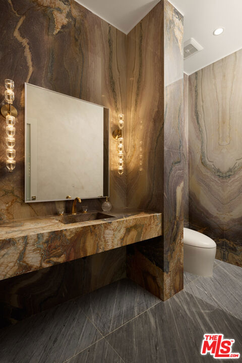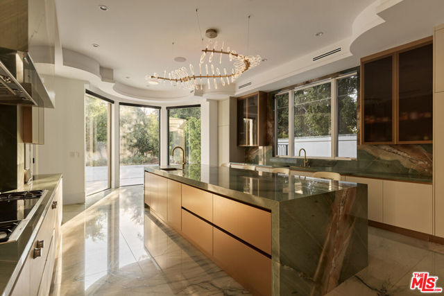 The trophy of the Beverly Hills Flats. A brand new construction 15,000 square foot estate with every amenity imaginable, a true 1 of 1. No expense spared with the most elaborate and finest Italian marbles ever placed in a home, and unparalleled attention to detail. Entry to the main level is through an arched doorway into a double-height rotunda foyer featuring a grand dual-curved travertine staircase. The circular art-glass skylight dome above, in a hand-crafted teal and ivory petal motif, is mirrored precisely in the custom stone floor medallion below, creating a palatial architectural conversation upon arrival. The main level includes two grand-scale great rooms with book-matched marble fireplace walls, a formal dining room, a private executive office, and the custom Versace powder room, fully tiled in authentic Versace Baroque porcelain with a solid-gold freestanding vessel sink, crystal pendant lighting, and a wall-mounted smart bidet toilet. The chef's kitchen is appointed with a champagne-bronze island topped in green onyx, matching onyx backsplash, Gaggenau double ovens, an integrated wine refrigerator, professional range and hood. A secondary prep kitchen is located adjacent. The upper level contains four bedrooms, each designed to the specification of a primary suite with no hierarchy between them. Every bedroom has its own fully appointed ensuite with its own distinct natural stone featuring THG Paris and Baccarat fixtures and mother of pearl inlays, a custom walk-in closet with illuminated glass-fronted wardrobe towers. Two bedrooms open to individual Juliet balconies, and the remaining two share a private sitting gallery with direct access to a terrace overlooking the rear grounds. The lower level unfolds as a dedicated entertainment and wellness floor designed for both large-scale hosting and restoration. A full stone-clad bar anchors the main lounge, which opens through folding glass walls to a secluded courtyard centered around a custom illuminated stone waterfall. A multi-level, cinema-grade theatre completes the entertainment offering. The wellness suite includes a steam shower, cedar dry sauna, and a private indoor plunge pool set beneath a fibre-optic star ceiling. A separate residential staff suite with its own access is also discreetly positioned on this level. The private elevator connects all three floors and is finished in mirror-polished champagne steel with a backlit four-panel amber and teal onyx feature wall and a marble inlaid floor. The rear grounds include a pool, elevated spa, a sunken fire pit seating area, multiple dedicated outdoor lounging and dining terraces, and a custom illuminated stone waterfall wall that serves as the rear garden focal point, equally dramatic by day and night. The property is fully integrated with a Control4 smart home system, seamlessly managing lighting, climate, audio-visual, security, pool systems, motorized walls, and architectural lighting throughout. Estates of this scale, level of finish, and position in The Flats rarely become available, with offerings of this caliber surfacing only a handful of times per decade.