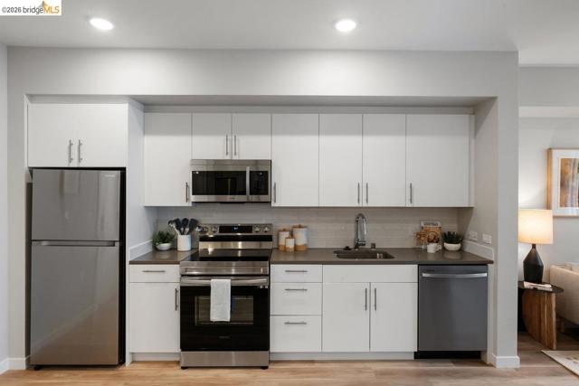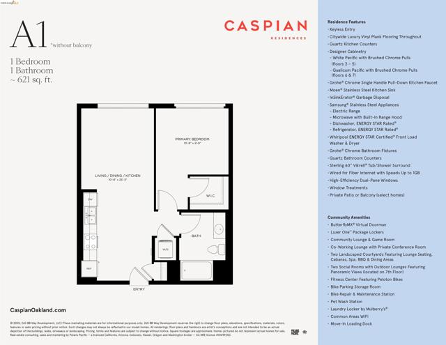 Now Selling at Caspian Residences at Brooklyn Basin - Discover modern waterside living in this thoughtfully designed 1-bedroom, 1-bathroom condo, spanning approximately 621 sq ft. Located in one of Oakland’s most exciting new communities, this home offers a rare chance to own in a vibrant, amenity-rich setting. The open layout features sleek finishes, a well-equipped kitchen with Samsung stainless steel appliances, quartz countertops, and modern cabinetry. High-efficiency dual-pane windows frame the bright living area, while the bathroom includes quartz counters and Grohe fixtures. Includes in-unit washer and dryer. Caspian residents enjoy landscaped courtyards, a game room, a fitness center, co-working spaces, and rooftop lounges with panoramic views. Situated on Oakland’s revitalized waterfront at Brooklyn Basin, the community provides direct access to parks, dining, and recreation, with Jack London Square, BART, and ferry service to San Francisco just minutes away. Includes one parking space. All images are representative of the development and may be of a similar unit.