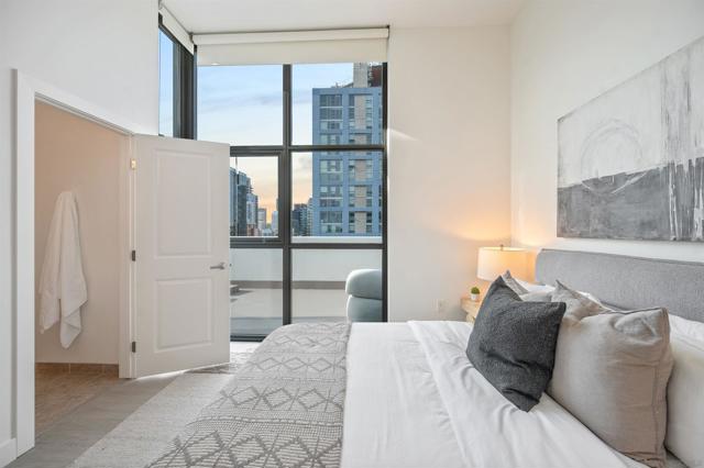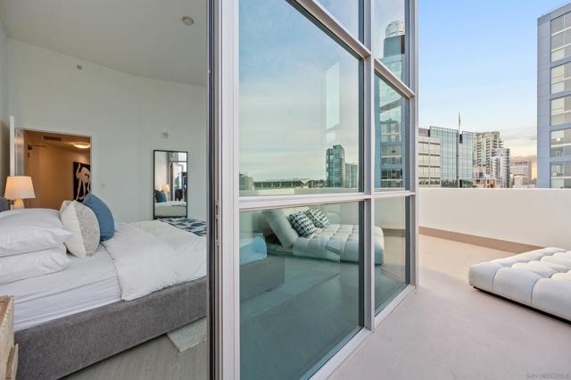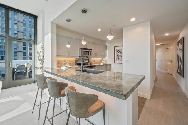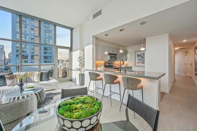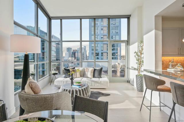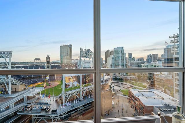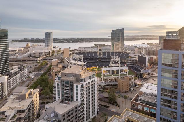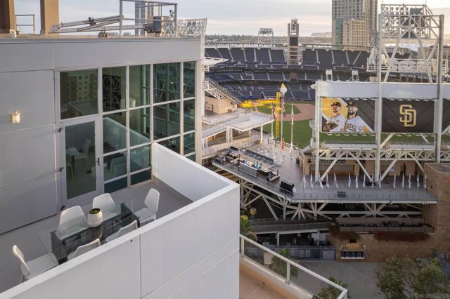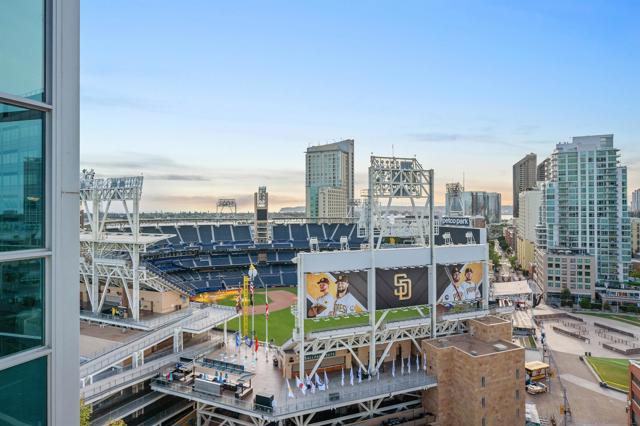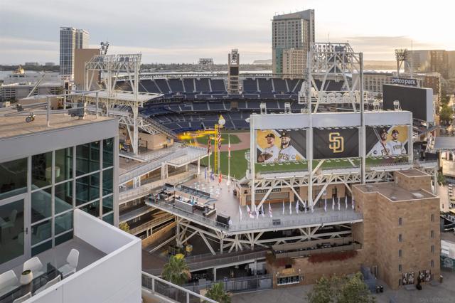 Penthouse with iconic Home Plate views—watch the Padres from your living room or your expansive private balcony. This 2 bed, 2 bath, 1,129 sq ft corner residence spans an entire side of the building, showcasing panoramic West, North, and East exposures with skyline and water views from Point Loma to Coronado. Enjoy incredible natural light through 14-foot floor-to-ceiling windows, along with newer flooring, fresh paint, and a remodeled kitchen. The unit offers rare privacy with only one shared wall, plus in-unit laundry, two prime P1 parking spaces by the elevator, and two private storage units. The oversized balcony is exclusive to the unit—not a shared space. Whether you are entertaining, relaxing, or catching a game from home, this penthouse delivers a truly unique Downtown lifestyle.