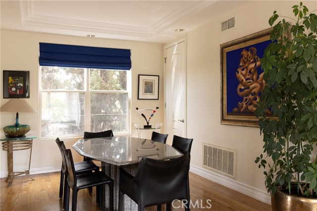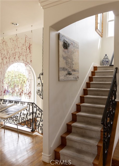 A dramatic two-story entry with a custom wrought iron staircase and rich hardwood floors makes an immediate impression. The formal living room is filled with natural light, featuring crown molding and custom drapery that flows into the dining room through an arched opening. A limestone fireplace anchors the sitting area, while the kitchen is outfitted with cherry cabinetry, honed granite, Viking appliances, and a bright island eating area with garden views. Upstairs, the primary suite offers a private balcony and a spa bath with double vanity, soaking tub, and separate shower. Three additional bedrooms are well-sized with updated baths, and laundry is conveniently located on the upper level. A private side yard, manicured landscaping, direct-access garage, and no HOA round out the package. Minutes from UCLA, Century City, Santa Monica, and the Sawtelle dining