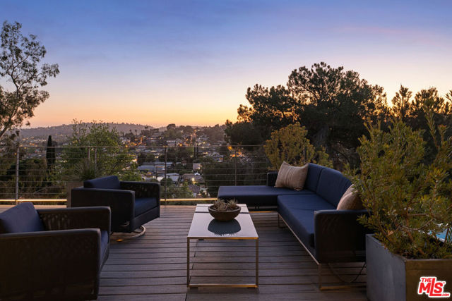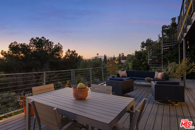 Perched on a hilltop in serene privacy, this expertly updated 1962 Modern delivers seamless indoor-outdoor living and spectacular views in vibrant Highland Park. Gorgeous vistas set the tone in the light-filled great room anchored by a fireplace; glass sliders open to the vast deck spanning the full width of the home. The stylish kitchen is beautifully appointed with a Heath tile backsplash and sleek white cabinetry; impressive finishes include oak plank floors and custom walnut detailing. Three lower-level bedrooms include an ensuite primary with a spa-like bath finished in Carrara marble, and outdoor access to a hot tub for unwinding with scenic views. Spiral stairs connect the generous upper and lower decks; arroyo rock lines the way to the terraced garden of native plantings, shaded by oak and purple acacia. Amenities include a 2-car carport with storage room, a Tesla EV charger, a laundry/storage area, and many system upgrades. Ideally situated between Highland Park and Pasadena, you're close to Arroyo Seco Park, Hermon's, Modu Cafe, Bub & Grandma's Pizza, Highly Likely, and more.