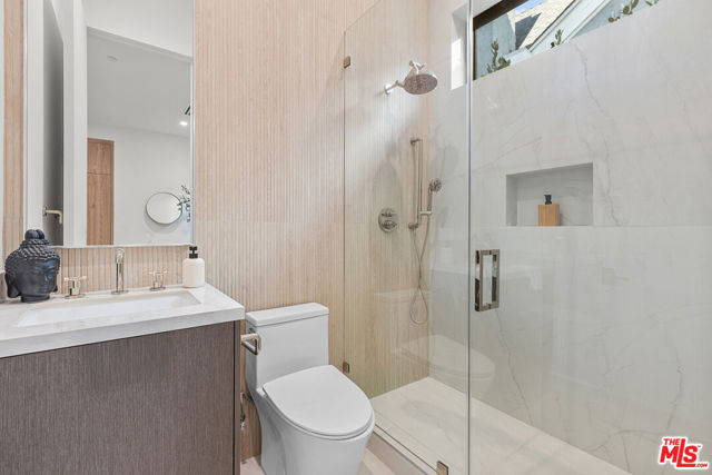 Introducing a brand-new architectural masterpiece that embodies sophistication and cutting-edge design. This 5-bedroom, 5.5-bath residence blends refined craftsmanship with the ultimate in modern convenience each bedroom is en suite, offering private comfort and style throughout. One spacious en suite bedroom is conveniently located downstairs, along with a sleek powder room ideal for guests. The home's main level features open-concept living and dining spaces with seamless indoor-outdoor flow, anchored by wide-plank engineered hardwood floors and an elegant fireplace. The chef's kitchen is outfitted with porcelain countertops and a full suite of Miele appliances including dual ovens, an 8-burner range, built-in coffee maker, wine cooler, and ice maker complemented by a separate pantry with additional storage and appliances. Smart home technology is seamlessly integrated throughout, featuring Control4 automation, Lutron lighting, Sonos audio across three zones, and Nest climate control. The home is equipped with a comprehensive security system, including high-definition cameras, along with fully paid-off solar panels for energy efficiency. Fleetwood doors and windows frame the interiors with natural light and connect to a private backyard retreat featuring a pool and spa with blue porcelain tile detailing, and a custom outdoor kitchen with built-in BBQ, fridge, and prep space. A show stopping rooftop deck crowns the home an entertainer's dream with panoramic city views, pre-installed wiring for outdoor camera/speaker systems and hookups for a gas BBQ and fire pit. Perfectly positioned near Century City, Westwood, and Beverly Hills, this residence offers effortless access to world-class shopping, dining, and entertainment!