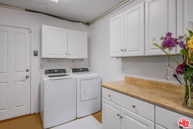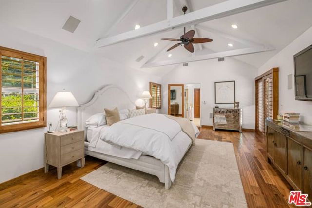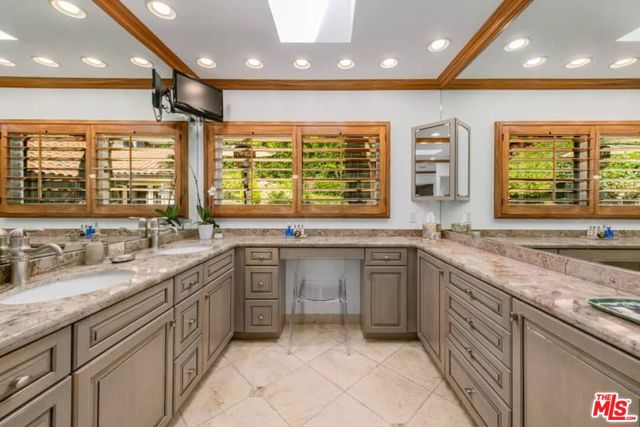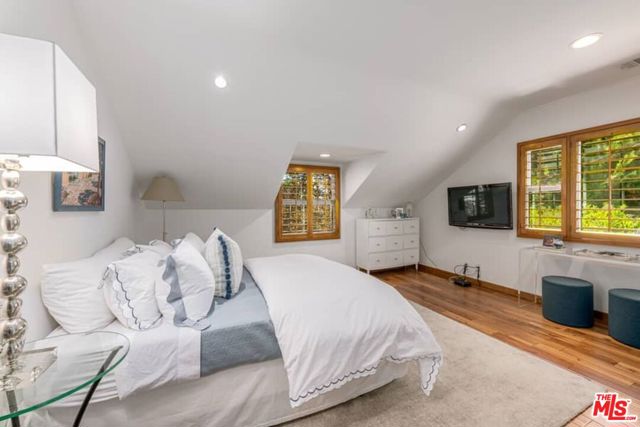 Nestled on a quiet cul de sac in Beverly Hills, this exceptional Spanish Contemporary 3 bedroom plus office/den (convertible to 4th BR) was custom designed and offers a flexible and easy floor plan beautifully integrating the indoor/outdoor living concept. The entry with high ceilings opens to a spacious living-dining area with a handsome brick fireplace, beamed ceilings and French doors opening to a tranquil, private backyard patio, pool and spa surrounded by mature, lush greenery. The enormous high quality chef's kitchen features travertine flooring, high ceilings, a huge center island, Kitchen Aid stainless appliances with oversized fridge, sizable pantry and direct access to a well organized garage. The lovely primary suite has pitched, beamed ceilings, a luxe bath, and an oversized walk-in closet. The secondary suite is also substantial with large bath and walk-in closet. A cozy den/office completes the downstairs. The upstairs suite is perfect for a gym or guest room. This home is in beautiful condition and is flooded with natural light, and offers green views from every room. There are hardwood floors throughout and closets and storage galore! Other amenities include 3 zone HVAC, surround sound system, and security system.