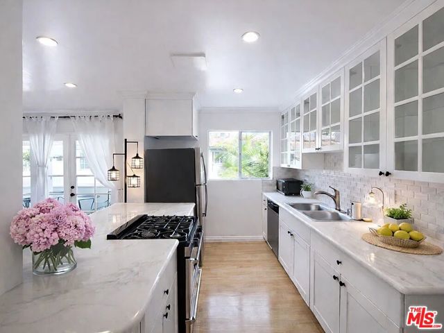 Bright & Renovated 2BR in Prime Santa Monica Location with Balcony, Pool & In-Unit Laundry Gorgeous and light-filled 2-bedroom, 1-bathroom upstairs apartment ideally located at 20th & Washington in Santa Monica. This charming residence offers exceptional privacy with no one above and features a spacious layout enhanced by abundant natural light throughout. The inviting living room opens through elegant French doors to a private balcony perfect for relaxing or entertaining. Beautiful hardwood floors run throughout the home, complemented by recessed lighting in every room and a modern split-system A/C for year-round comfort. The newly renovated kitchen showcases Calacatta marble countertops, glass-front cabinetry, and excellent storage. Outfitted with stainless steel appliances including a gas range, dishwasher, and double sink, plus convenient breakfast bar seating. The bathroom features tumbled marble finishes and a luxurious jetted bathtub. Additional highlights include in-unit washer and dryer, generous closet space, and a gated property for added security. Set within a classic Colonial-style building with a pool, this pet-friendly home also includes street parking (permit required through the City).Ideally situated just four blocks from Whole Foods and Trader Joe's, with easy access to shopping, dining, and all that Santa Monica has to offer.