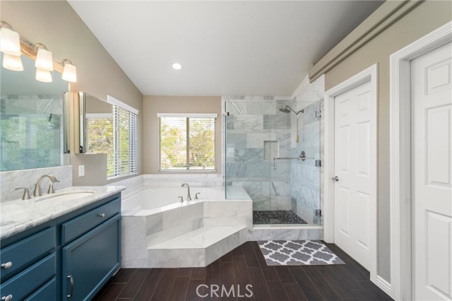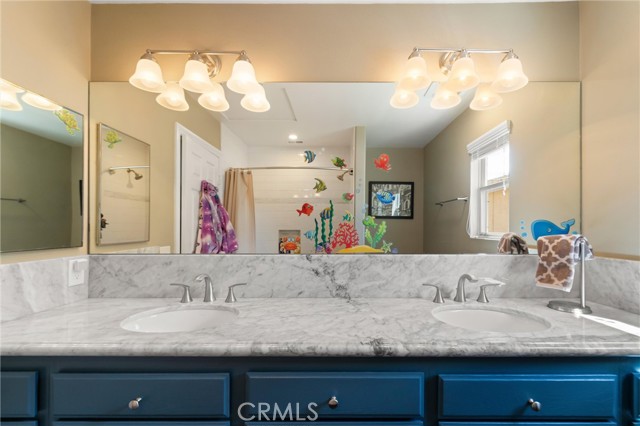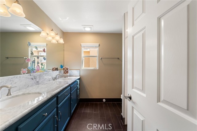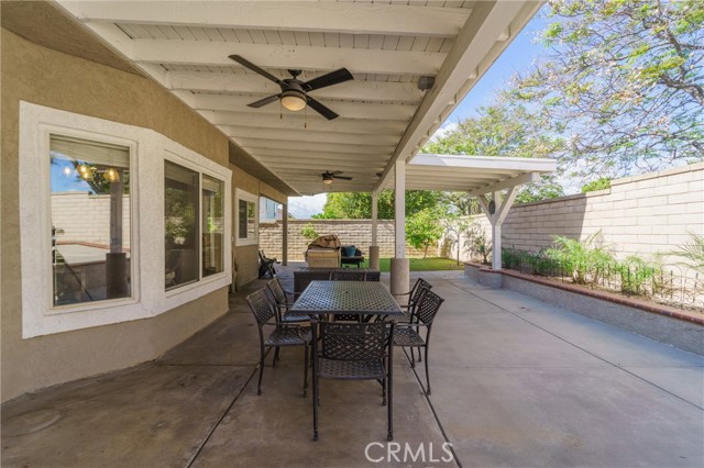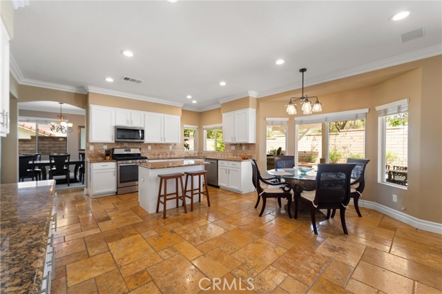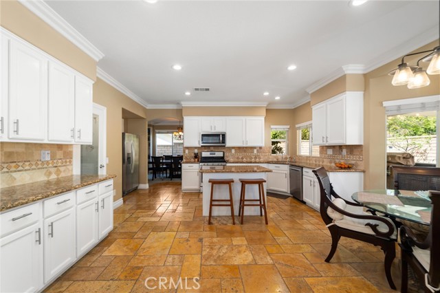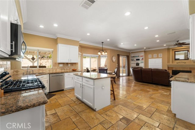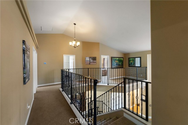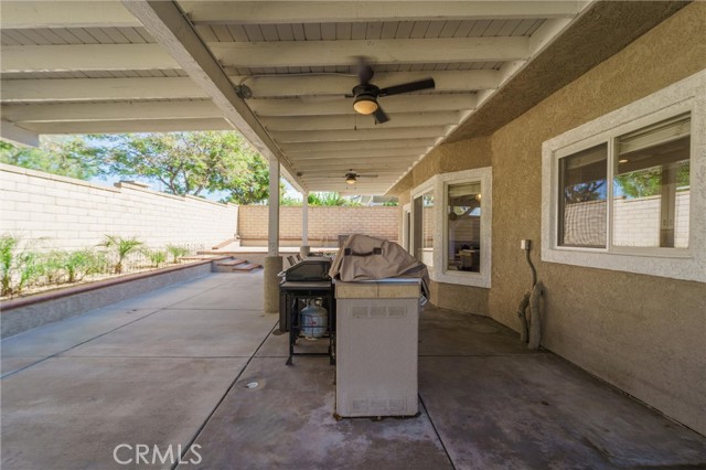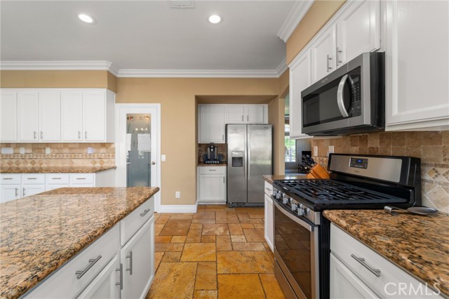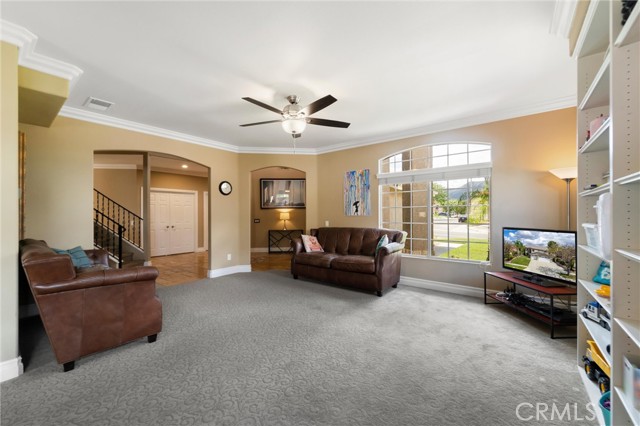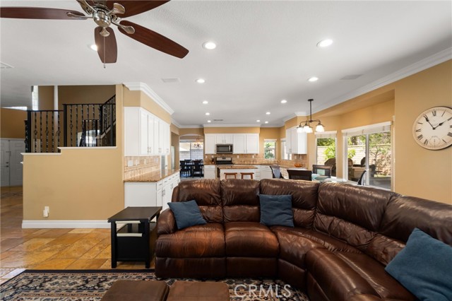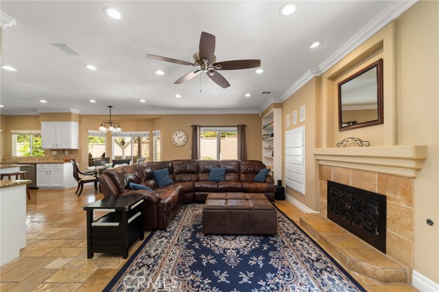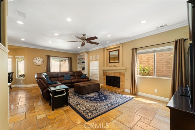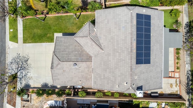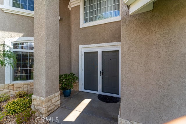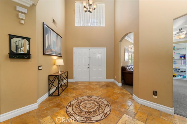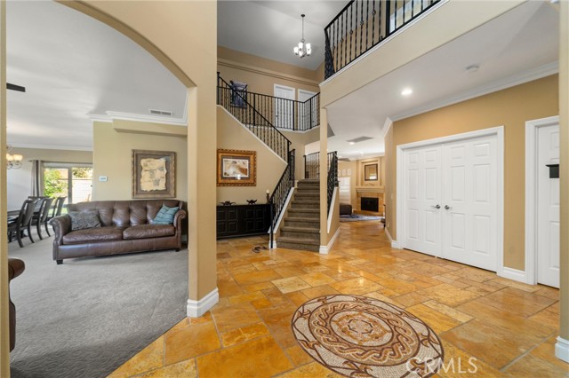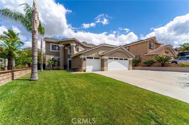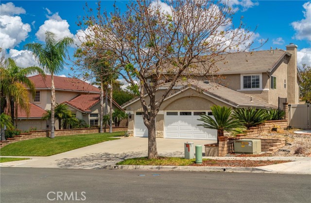 Beautifully maintained and significantly upgraded two-story single-family home offering 3,195 square feet of well-designed living space on a 7,405-square-foot (0.17-acre) lot in an established Corona neighborhood. Built in 1997, the home includes 4 bedrooms, 2.5 bathrooms, a 3-car garage, and a wood-burning fireplace. Recent major improvements include a fully owned solar system approx. 5.2 Kw, a nearly brand-new air conditioning system and a complete PEX re-pipe throughout the home deliver energy efficiency, year-round comfort, and long-term peace of mind. The entry opens to a dramatic two-story foyer finished in travertine tile with a custom mosaic medallion and a wrought-iron staircase. The adjacent formal living and dining rooms feature arched windows, crown molding, chandelier lighting, and sliding-glass access to the backyard. The family room centers on a stone-surround fireplace with built-in display niches and opens directly into the kitchen, which is finished with granite counters, white cabinetry, stainless-steel appliances, a tumbled-stone backsplash, and a center island with seating. A walk-in pantry sits behind an etched-glass door, and a bay-window breakfast nook overlooks the yard. Upstairs, the primary suite features high ceilings and neighborhood/mountain views, with an en-suite bath finished in marble counters, a deep soaking tub, a frameless-glass walk-in shower, and dual walk-in closets. Connected by an open air balcony/hallway, three additional bedrooms and a full bathroom complete the spacious upstairs living space. Outside, professional landscaping, mature palms, and tiered stone retaining walls frame the property, while the side and back yards feature a collection of mature, producing citrus trees and a thriving avocado tree. A concrete-tile roof and attached 3-car garage with vent fan system, complete the exterior. Located in Riverside County with easy access to top-rated Corona schools, shopping, dining, parks, and the 91 and 15 freeways. This home is move-in ready and thoughtfully cared for throughout.