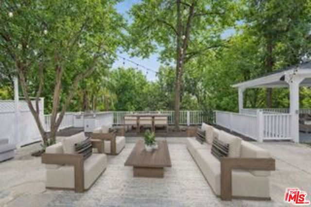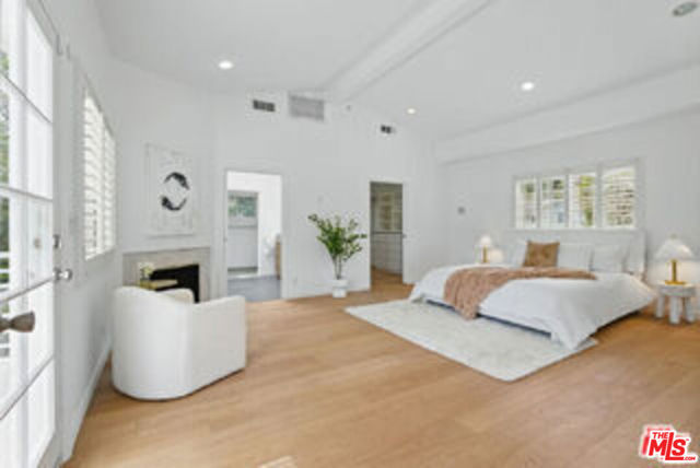 Enchanting storybook home, nestled on a peaceful, tree-lined street, seamlessly blends modern updates with timeless charm. Set on nearly 20,000 sqft, the property offers exceptional curb appeal with five spacious bedrooms, four bathrooms, a half-circle driveway, and mature landscaping, creating a private paradise. Inside, the contemporary traditional design radiates natural warmth, featuring custom White Oak flooring, recessed lighting, a cozy fireplace, and a stylish bar area bathed in abundant natural light. The expansive dining room, with an additional nook and grand fireplace, is perfect for entertaining. The chef's kitchen offers generous cabinetry, countertop space, a breakfast area, breakfast bar, and high-end stainless steel appliances. The primary retreat is a true sanctuary with vaulted ceilings, a private balcony, a spacious walk-in closet with custom cabinetry, and an en suite bathroom with a rainfall shower, Jacuzzi tub, skylight, and double vanity. The backyard is an oasis, with an oversized pool, waterfall Jacuzzi, charming cabana, and an outdoor kitchen with a grill and sink ideal for al fresco dining and entertaining. Additional features corner lot including a side driveway leading to the bottom level, an attached two-car garage, an expansive side yard, a dedicated laundry room, and central AC/heat. Conveniently located near trendy restaurants, shopping, and amenities such as The Village, Cedars-Sinai, Whole Foods, and Equinox, with easy access to the 101 Freeway, this home offers the perfect balance of privacy, luxury, and convenience. Prepare to be amazed. *Some photos are Virtually Staged both Interior and Exterior including Tennis Court*